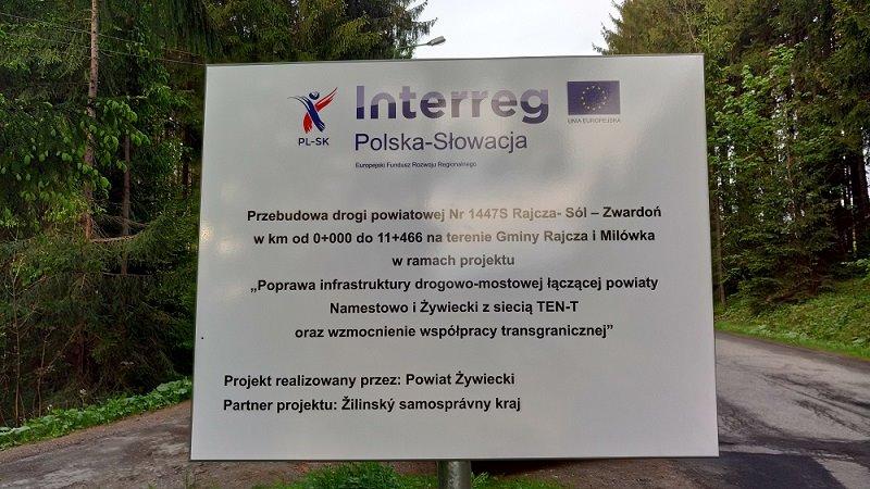 Powiat Żywiecki realizuje prace inwestycyjne będące przedmiotem projektu „Poprawa infrastruktury drogowo – mostowej łączącej powiaty Námestovo i Żywiecki z siecią TEN-T oraz wzmocnienie współpracy transgranicznej” w ramach Programu Interreg V-A Polska-Słowacja 2014-2020. Projekt podejmuje wyzwanie polepszenia dostępności infrastruktury transportowej, usprawnienia połączeń pomiędzy lokalną i regionalną siecią transportową z siecią TEN-T Bałtyk – Adriatyk. W oczekiwaniu partnerów zamierzenie powinno mieć pozytywny wpływ na zakładany wzrost spójności terytorialnej regionów, wzrost konkurencyjności, transformacji ekologicznej oraz pobudzenie gospodarcze ośrodków regionalnych. Istotną kwestią jest zakładany efekt polepszenia bezpieczeństwa na drogach.