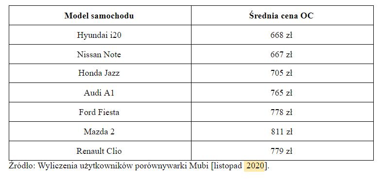 Dla porównania spójrzmy na średnie ceny OC modeli miejskich. Okazuje się, że ubezpieczenie niektórych z nich może być nawet dwukrotnie tańsze niż ochrona sportowego auta.