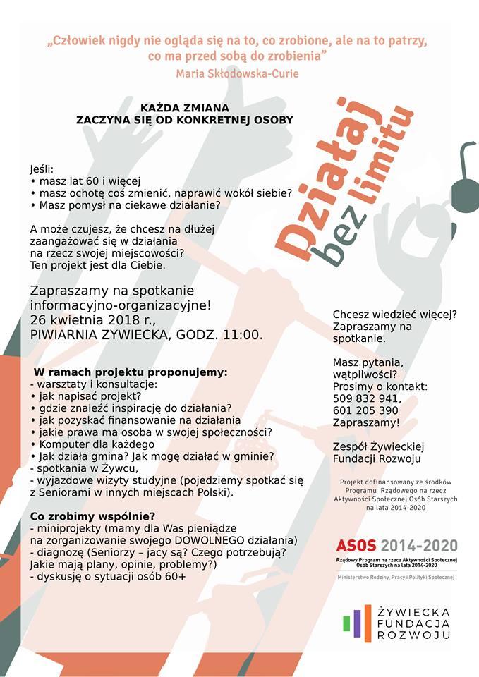 Żywiecka Fundacja Rozwoju startuje z projektem, który właśnie do nich jest skierowany, mającym na celu ich aktywizację społeczną w różnych obszarach. "Działaj bez limitu", bo taką nazwę nosi ów program, przeznaczony jest dla osób w wieku 60 i więcej lat. Pierwsze spotkanie organizacyjno-informacyjne dotyczące jego szczegółów odbędzie się 26 kwietnia, o godzinie 11:00 w Piwiarni Żywieckiej.