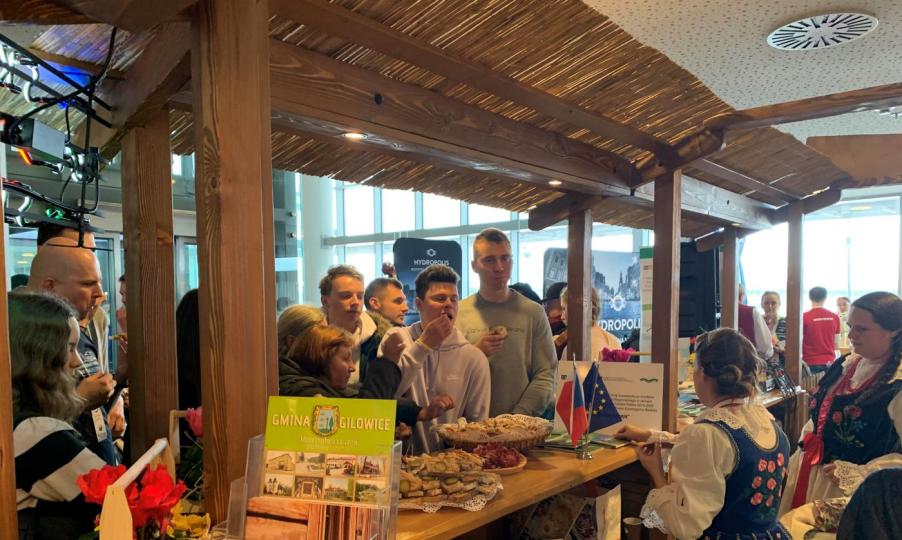 Odwiedzający nasze stoisko mieli możliwość degustacji tradycyjnych potraw regionalnych takich jak: chleba ze smalcem, różnego rodzaju sera, tradycyjnych ciast i wędlin, pierników żywieckich oraz piwa.
