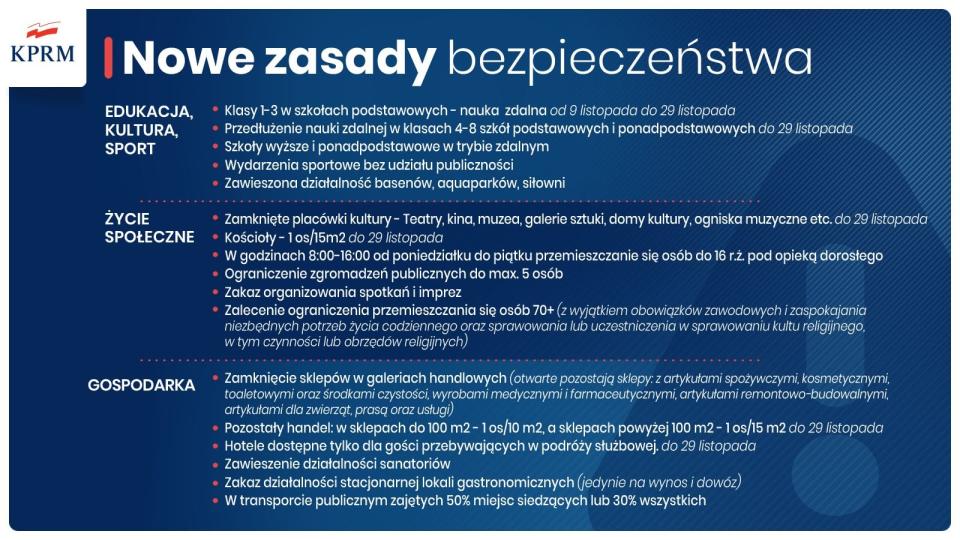 Nowe zasady bezpieczeństwa Opublikowano środa, 04 11 2020 Utworzono: środa, 04 11 2020 Kancelaria Premiera poinformowała o nowych obostrzeniach: Udostępnij Drukuj E-mail Poprzedni artykuł Następny artykuł