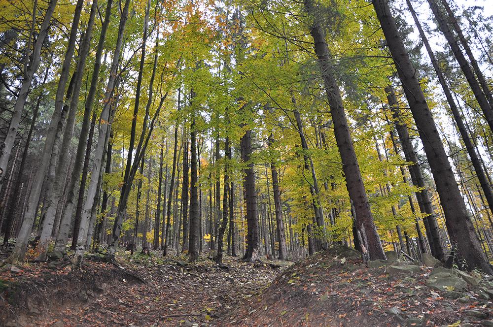 Szlak zielony na Przegibek z Rycerki Górnej - Kolonii zamienił się o tej porze roku w żółto – pomarańczowy las.