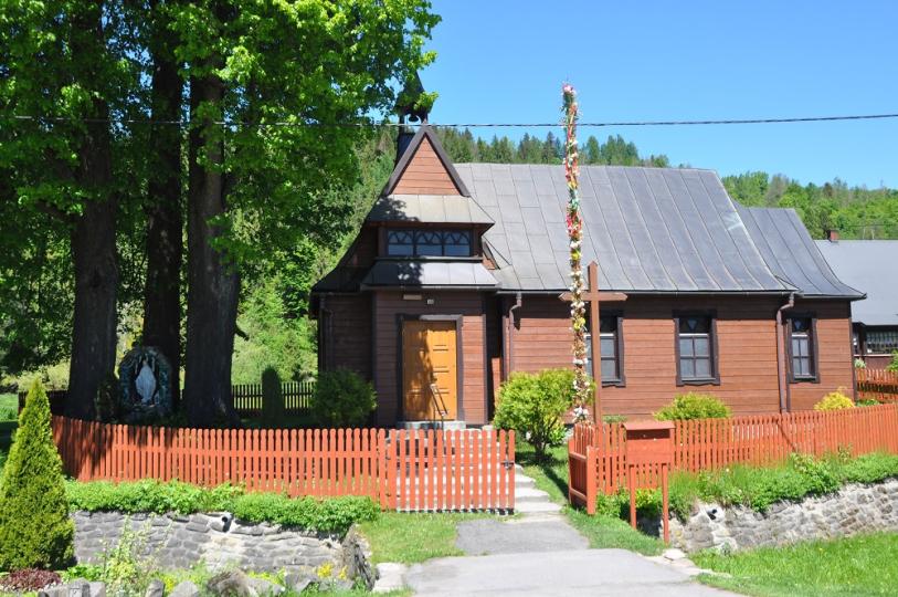 500 metrów dalej w centrum wsi stoi Kaplica Matki Boskiej Częstochowskiej w stylu góralskim, z drewna świerkowego pozyskanego zmiejscowych lasów. Jej budowę rozpoczęto w 1930 roku według projektu Włodzimierza Chwiruta – zarządcę lasów Habsburgów. Warto wspomnieć że kapliczkę tą odwiedził Karol Wojtyła. Jak głosi legenda: „na początku XX wieku na jednej z lip była figurka Pana Jezusa. Pewnego dnia piorun trafił w lipę z Jezusem. Stał się wtedy cud – lipa została opalona, a figurce nic się nie stało. Od tamtej pory mieszkańcy postanowili w tym miejscu postawić kaplicę. Po latach Pani Helena Kreczmer oddała figurkę do Muzeum w Żywcu. Ponadto wieczorami pomiędzy lipami widoczne było światło, jakby znak od samego Boga, gdzie wybudować Dom Boży. Teren pod budowę świątyni podarował Jan Szlachta, budulec, czyli drewno, załatwiono u zarządcy Habsburgów, pana Firuta. Budową kaplicy zajęli się mieszkańcy wsi.” Obok kaplicy rosną trzy 120- letnie lipy, wśród których stoi figurka Matki Boskiej. We wnętrzu kaplicy znajduje się obraz św. Huberta oraz duży żyrandol z poroży jeleni, podarowane przez myśliwych koła łowieckiego.