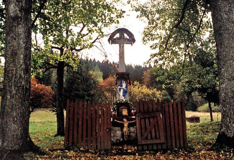 Nieopodal na kamiennej podmurówce znajduje się Świątek – Krzyż Boża Męka z 1833 roku. na którym stoi betonowy krzyż z żeliwnym odlewem Ukrzyżowanego Chrystusa. Na ścianie frontowej krzyża znajduje się płaskorzeźba Matki Boskiej Bolesnej.