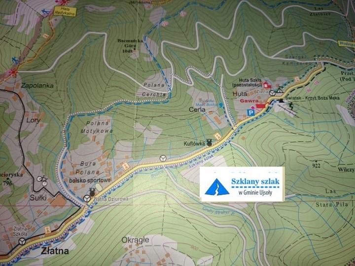 Kolejnym obiektem „na szklanym szlaku” są pozostałości po leśnej hucie szkła, działającej w latach 1815- 1875, o historii której pisaliśmy tutaj W kościele parafialnym w Ujsołach zachował się wyprodukowany w tej hucie kielich, w kościele w Zwardoniu „pająk”- świecznik, a w Muzeum w Żywcu karafka.