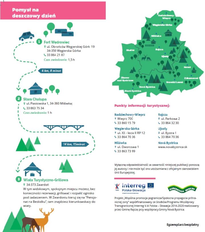 Co robić w górach gdy pada deszcz? Mylą się Ci, którzy myślą, że żywieckie miejscowości oprócz wspaniałych szlaków i widoków nie mają nic do zaoferowania. Przedstawiamy ulotkę z propozycją miejsc, które warto odwiedzić w Beskidzie Żywieckim akurat wtedy, gdy aura nie sprzyja wędrówkom po górach. Ulotki z letnimi atrakcjami turystycznymi regionu są już dostępne w punktach informacji turystycznej. Dzięki nim zaplanowanie wycieczki będzie dużo łatwiejsze.
