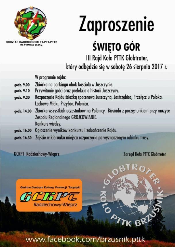 W tym roku Koło PTTK Globtroter wyznaczyło 8 kilometrowy odcinek szlaku od Juszczyny aż po Lachowe Młaki. Jest to połączenie szlaku niebieskiego schodzącego do Sopotni [rondo na przełęczy u Poloka] i żółtego szlaku biegnącego na Słowiankę. Tym szlakiem Koło PTTK Globtroter zamierza przeprowadzić III rajd Koła Globtroter 26.08.2017r. Oto cały program rajdu: