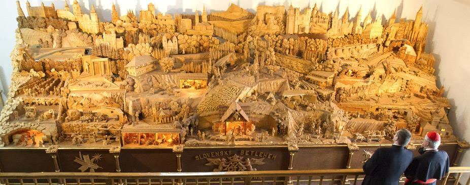 Bo gdy rozejrzymy się wokół znajdującego się w centrum kompozycji żłóbka, zobaczymy ponad nim najpierw Krywań, świętą górę Słowaków. Poznamy ją po charakterystycznym kształcie – rozpoznawalnym nawet dla tych, którzy do Tatr nie zaglądają. Jest obecna na awersie wszystkich słowackich eurocentów. Po prawej i lewej stronie Krywania znajdziemy najsłynniejsze słowackie budowle: bratysławski zamek, zamki w Dewinie, Trenczynie, w Bojnicach. Jest i największa słowacka twierdza – Zamek Orawski. Pomiędzy nimi stoją domy i kościoły. To na lewo, czyli na zachód od Krywania, bo układ szopki odpowiada z grubsza geograficznej rozciągłości Słowacji – to tak jakbyśmy patrzyli na jej mapę. Na prawo, czyli na wschód od tatrzańskiego szczytu, bywalcy rozpoznają Lewoczę, Spiski Hrad, Bardejów, Preszów, Koszyce.