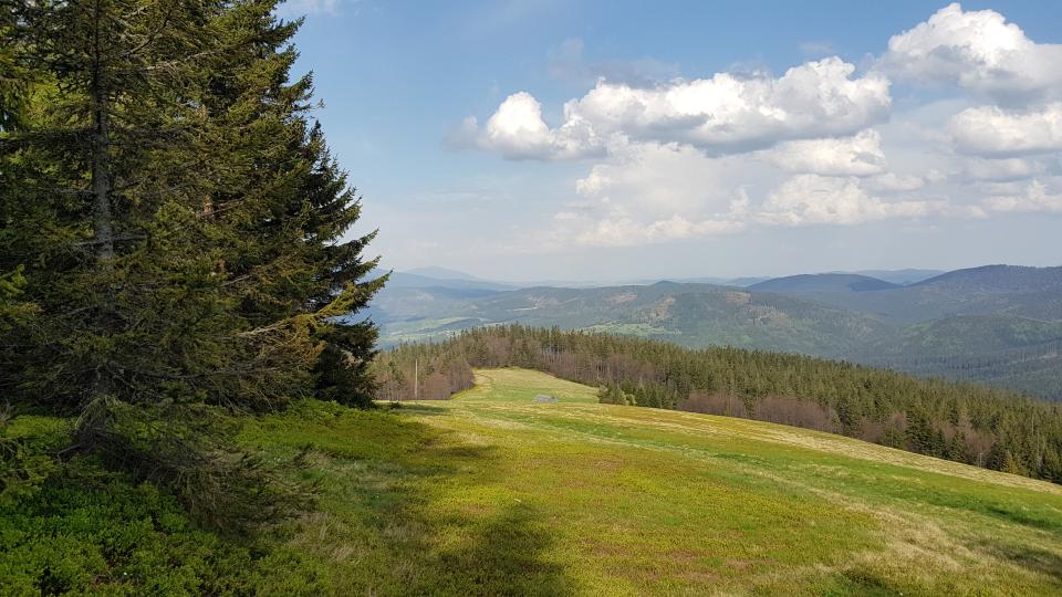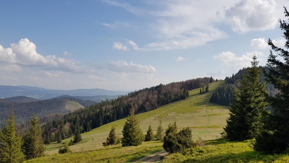 Następnie łagodnie schodzimy za znakami zielonym i żółtym, aż do rozwidlenia po ok. 1,5 km. Żółty skręca w prawo do Soblówki, a my kontynuujemy marsz szlakiem zielonym przez szczyt Wiertalówki.