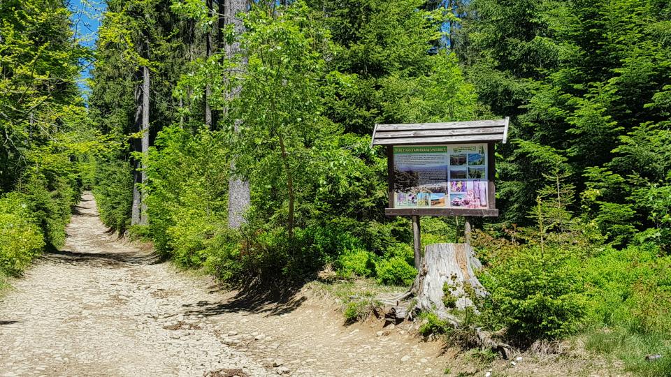My kontynuujemy wędrówkę szlakiem czarnym, dalej szeroką drogą, która robi się bardziej stroma, ale nie jest w żaden sposób męcząca. Mijamy kolejne skrzyżowanie z szeroką bitą drogą, przy tablicy informacyjnej o przyczynie degradacji świerkowych drzewostanów beskidzkich.